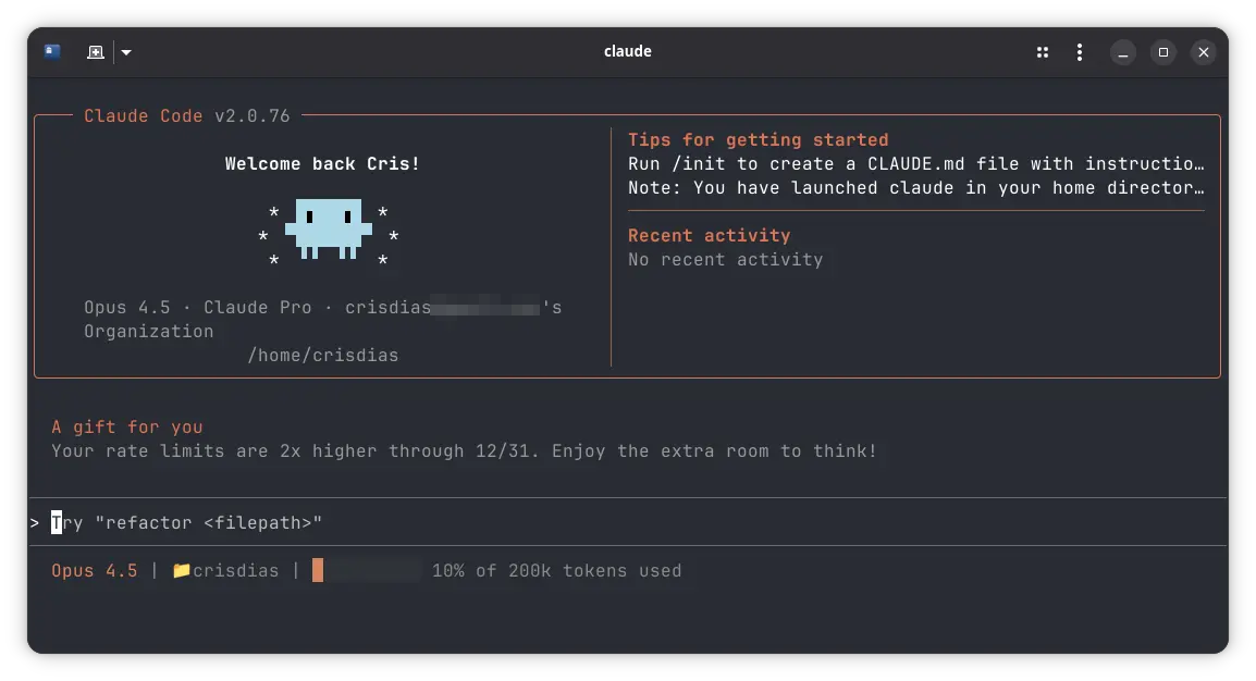 É o Claude Code, a versão “interface linha de comando” da minha IA preferida — e que em 2025 humilhou todas as outras com o modelo Opus 4.45.