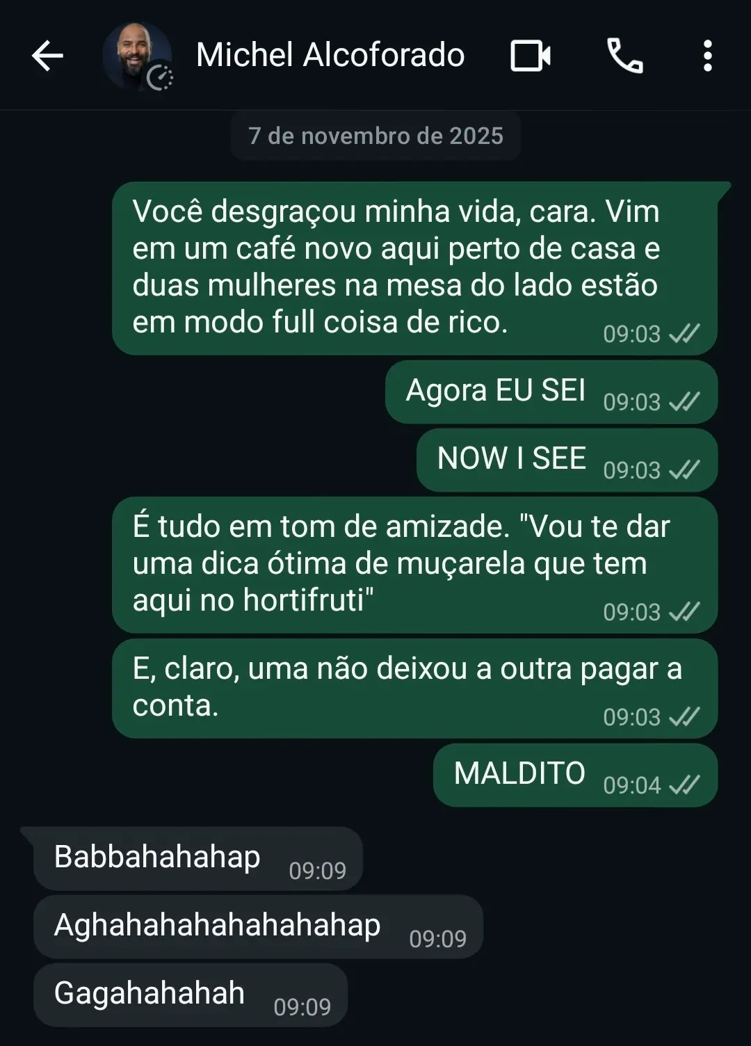 Se isso não bastasse, ainda tive o privilégio de ver Paulo Vieira contando sobre como deu vida à série em um evento na SoHo House São Paulo e só posso dizer que ele é tudo isso mesmo. Um gênio de coração enorme, extremamente gentil e carinhoso. É meu “sonho dourado” de entrevista no Boa Noite Internet — exceto que provavelmente eu começaria a conversa do mesmo jeito que ele começou quando foi no Mano a Mano: “Não tem como isso aqui dar certo. Eu vou querer te impressionar, Mano, falar coisas inteligentes, virar seu amigo.” Aliás, recomendo muito essa entrevista.
