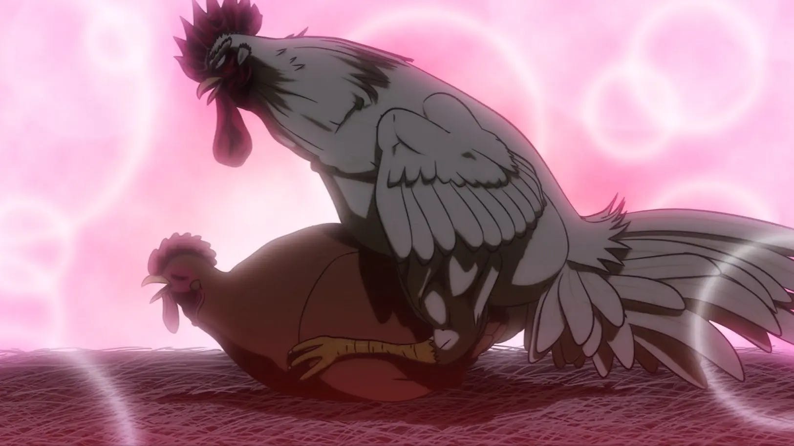 No sentido oposto, tem Rooster Fighter, que se eu contar a premissa, você vai falar “é o quê, Cristiano?”. Um galo, Keiji, tem superpoderes de luta, que usa para derrotar monstros mutantes gigantes bizarros que aparecem pelo Japão. No caminho, é claro, ele vai encontrar outros galináceos para ajudar na sua saga. O especial dele é ativado pelo grito… “cocoricóóóóóó!!!” (kokekokko). É bem a linha do humor do anime, que pega os códigos super sérios de mangá de luta (poses dramáticas, gritos de golpe, rivalidades intensas) e aplica tudo isso a um galo brigando com monstrengos.